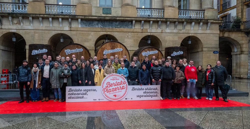 La temporada de sidrerías 2026 fue presentada por el sector en la Plaza de la Constitución de San Sebastián. Además de sidrerías de Gipuzkoa, Bizkaia y Álava, también estuvieron presentes las de Navarra y el País Vasco Norte. Por ello, dentro de la Denominación de Origen Sidra Vasca, el objetivo era ilustrar y explicar el trabajo que se está realizando para unir los sectores de la manzana y la sidra de todos los países, y en él participaron representantes de todos ellos. Se abrió un barril con sidra de cada país para que la gente pudiera degustarla. De hecho, el camino para expandir la Sidra Vasca, que abarca Gipuzkoa, Bizkaia y Araba, al País Vasco Norte está en marcha y se han dado varios pasos. Una vez logrado esto, el compromiso de incluir a Navarra también está ligado.
