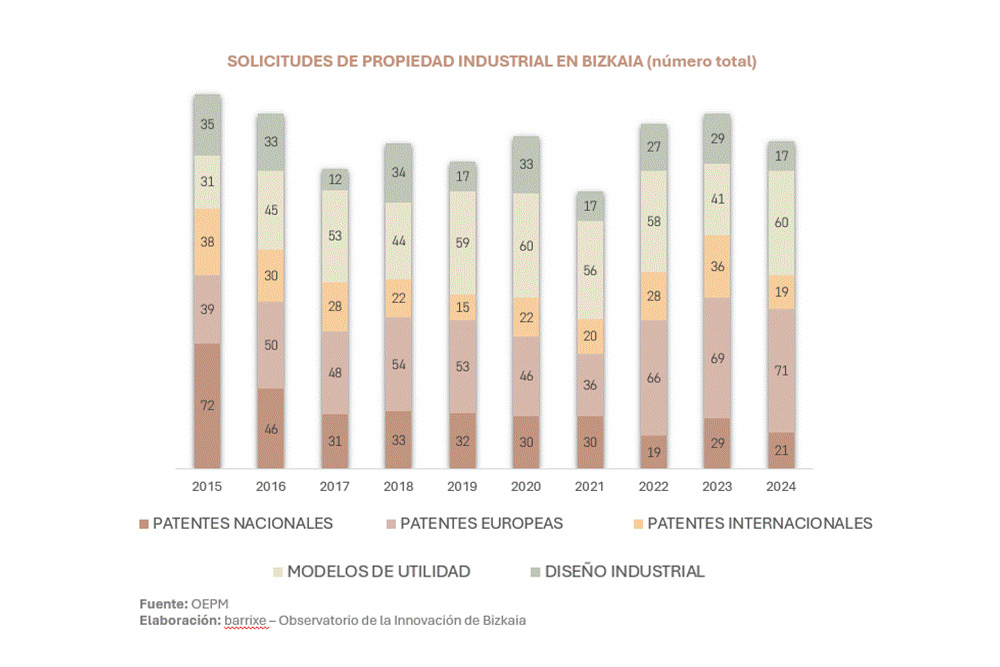 En Bizkaia, las solicitudes de Patentes Nacionales caen un 19%, hasta 21, lo que representa la mitad de las presentadas en la CAPV, frente al 60,4% del 2023. En total, la comunidad registra 42 solicitudes nacionales.