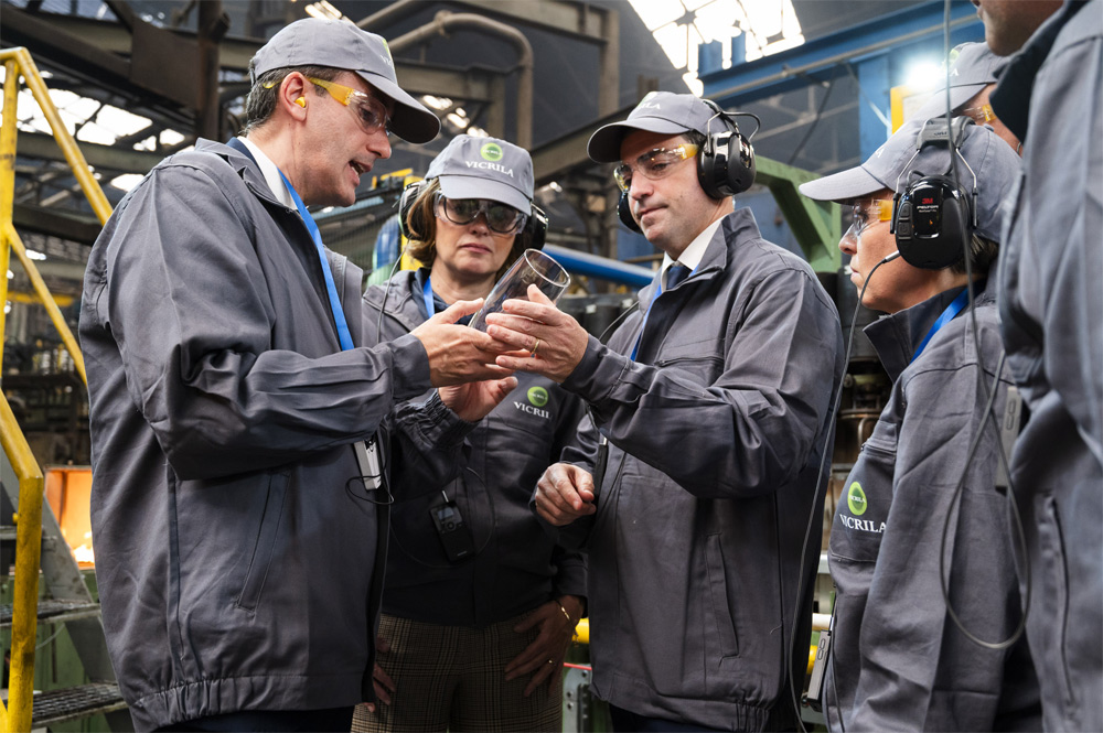 En las instalaciones de Vicrila, de 100.000 metros cuadrados de superficie total y donde trabajan más de 230 personas, han conocido de primera mano su proceso productivo y las inversiones realizadas, por más de 17 millones, que han permitido a la compañía mejorar su competitividad, eficiencia y sostenibilidad. Así, han visto en funcionamiento el nuevo sistema de control de calidad de producto, basado en cámaras de visión especial para vidrio, y la segunda línea de fabricación de copas, que permite incrementar la producción y atender las demandas del mercado en productos técnicamente más exigentes y estéticamente más elegantes y complejos.