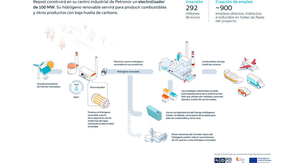 Se trata de una iniciativa estratégica para Petronor y para Euskadi, alineada con la estrategia europea, y que demuestra la firmeza con que la empresa avanza en su descarbonización, ya que la puesta en marcha del electrolizador de 100 MW permitirá abatir hasta 167.000 toneladas de CO₂, al sustituir una parte de la producción de hidrógeno a partir de gas natural por hidrógeno producido a partir de fuentes de electricidad renovable.