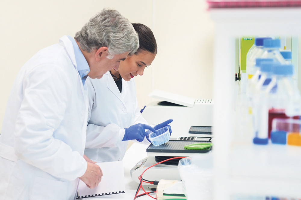 Laureano Simón, presidente y fundador de Oncomatryx, con una investigadora del equipo de la biofarmacéutica, que dispone de centros en el País Vasco y Estados Unidos. Foto: Oncomatryx
