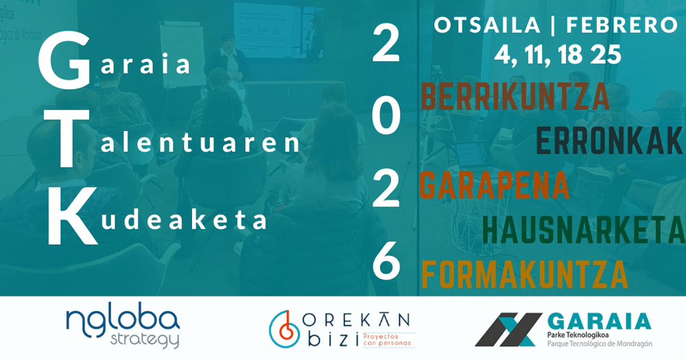 Garaia Parque Tecnológico, con la colaboración de Orekan Bizi y Ngloba Strategy, volverá a convertirse en un punto de encuentro de referencia para el intercambio de conocimiento, la conexión entre profesionales y la innovación en la gestión del talento. Durante el mes de febrero se celebrará un ciclo de cuatro jornadas en las que diferentes profesionales y empresas abordarán algunos de los retos actuales en el ámbito de las personas y las organizaciones. La cita será todos los miércoles de febrero (días 4, 11, 18 y 25), en horario de 9:00 a 11:00, en PTGaraia, con participación gratuita y abierta a todo tipo de públicos interesados. Program