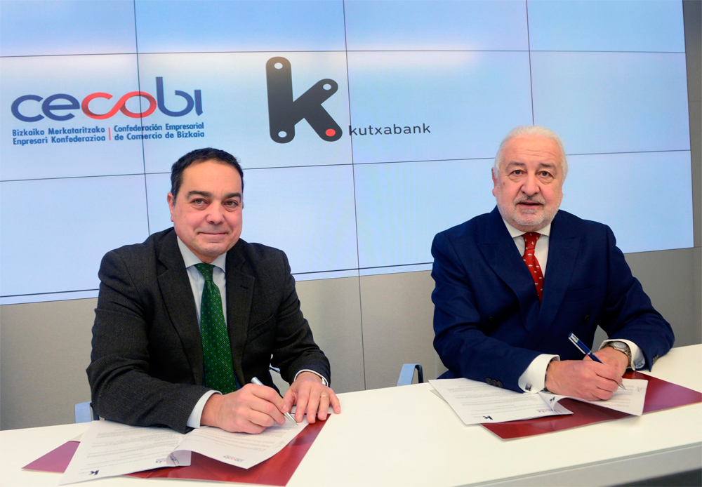 El presidente de la Confederación Empresarial del Comercio de Bizkaia, Pedro Campo, y el director de la Red Minorista de Kutxabank en el territorio, Xabier Solaetxe, han renovado el acuerdo de colaboración, cuya vigencia será de un año prorrogable y, han fijado una serie de fórmulas para mantener la competitividad de los comercios de Bizkaia en un entorno de intensa digitalización, en el que los nuevos hábitos de compra han hecho a los comercios buscar nuevas formulas para fortalecer el vínculo con la clientela a través de herramientas que ayuden a adaptarse a las nuevas necesidades.Por ello, las partes firmantes han acordado aportar solucion