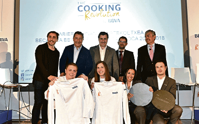 BBVA y El Celler de Can Roca, dirigido por los hermanos Roca, pusieron en marcha, en 2014, ‘The Cooking Revolution’, una alianza global que cuenta con la participación de siete escuelas de gastronomía de todo el Estado, entre ellas La Escuela Superior de Hostelería de Bilbao. A través de este proyecto se han concedido cuatro becas formativas entre el alumnado de la Escuela Superior de Hostelería de Bilbao con el objetivo de ofrecer oportunidades a las jóvenes promesas de la gastronomía, poner en valor las distintas gastronomías locales y desarrollar acciones formativas dirigidas tanto al mundo académico como empresarial.En su presentación en Bilbao los hermanos Roca estuvieron acompañados de Carlos Gorría, director de la Territorial Norte de BBVA, y fueron recibidos por el alcalde de Bilbao, Juan Mari Aburto, quien recordó que “la gastronomía es uno de los pilares básicos de atracción con que cuentan Bilbao, Bizkaia y Euskadi en su conjunto”, por lo que es necesario “estar siempre a la última” también en este campo.