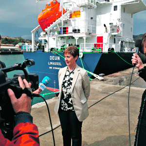 La consejera de Desarrollo Económico e Infraestructuras, Arantxa Tapia, participó en el acto de entrega del buque mercante ‘Deun’, en el muelle de Pasai Donibane. Se trata de un mercante polivalente construido por Balenciaga en su astillero de Zumaia, del que Tapia ha sido madrina.