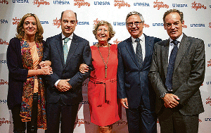 Mirenchu del Valle, de Unespa; J.Manuel Inchausti (Mapfre); Pilar González de Frutos, presidenta de Unespa; J.Paul Rignault (AXA) y Santiago Villa (Generali) presentaron la campaña ‘Estamos seguros’.