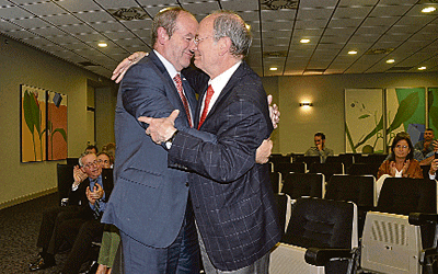Ricardo Barkala se abraza con Ibon Areso, a quien sustituye como presidente del Consorcio.