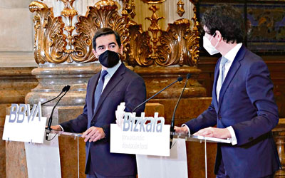 Carlos Torres, presidente de BBVA, y Unai Rementeria, diputado general de Bizkaia, rubricaron el nuevo acuerdo público-privado.