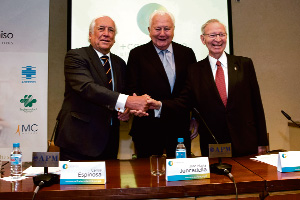 Los presidentes de Fraternidad-Muprespa, Asepeyo y MC Mutual en el momento de sellar el acuerdo.