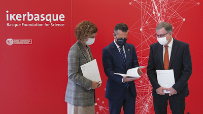La producción científica de Euskadi se ha incrementado un 13%, según los últimos datos, hasta alcanzar las 7.523 publicaciones anules. Esto supone el mayor incremento en los últimos ocho años. Con un crecimiento superior al registrado a nivel estatal, el peso relativo de Euskadi no ha cesado de aumentar en los últimos diez años y ha alcanzado en 2020 el 6,7% de la producción científica del Estado. Así, la CAV ha duplicado su producción científica en la última década, según los datos del Informe sobre la Ciencia en Euskadi 2021, presentado por el consejero de Educación Jokin Bildarratz, la directora de Investigación, Amaia Esquisabel y el director científico de Ikerbasque, Fernando Cossío, en la imagen.