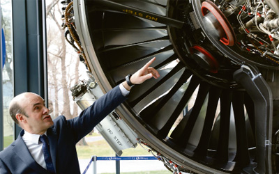 Carlos Alzola, director general de ITP Aero, señala una parte de un motor de la compañía vasca.