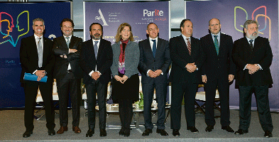La séptima entrega de ‘Diálogos a 3. Los líderes empresariales responden’, encuentros promovidos por SEA Empresarios Alaveses y el Parque Tecnológico de Álava, reunió a Jesús Esmorís, CEO de Tubacex; Asier Atutxa, presidente de la Autoridad Portuaria de Bilbao; y Urtsa Errazti, CEO de JEZ Sistema Ferroviarios, para hablar sobre la realidad económica actual. Los tres compartieron la necesidad de afrontar con cautela pero “sin dramatismos” la etapa económica vigente que dibuja el escenario internacional, para aprovechar “las grandes oportunidades” que presentan países como China o India. Esmorís, Atutxa y Errazti también coincidieron en censurar los efectos que la incertidumbre política tiene sobre el tejido empresarial. En la imagen, los tres intervinientes posan junto a directivos de SEA y representantes institucionales.