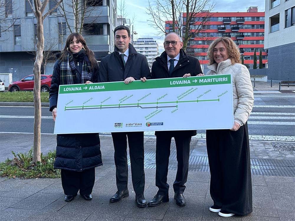La firma del convenio se ha materializado esta mañana en el propio barrio, en las inmediaciones por donde en el futuro discurrirá el trazado tranviario. Presidido por el lehendakari Imanol Pradales, el acuerdo de financiación ha sido rubricado por la alcaldesa de Vitoria-Gasteiz, Maider Etxebarria, la consejera de Movilidad Sostenible y presidenta de Euskal Trenbide Sarea (ETS), Susana García Chueca, y el diputado general de Álava, Ramiro González. Todos ellos han coincidido en destacar la colaboración institucional para consumar la extensión del sistema de transporte de alta capacidad que vertebra toda la ciudad hasta Zabalgana.