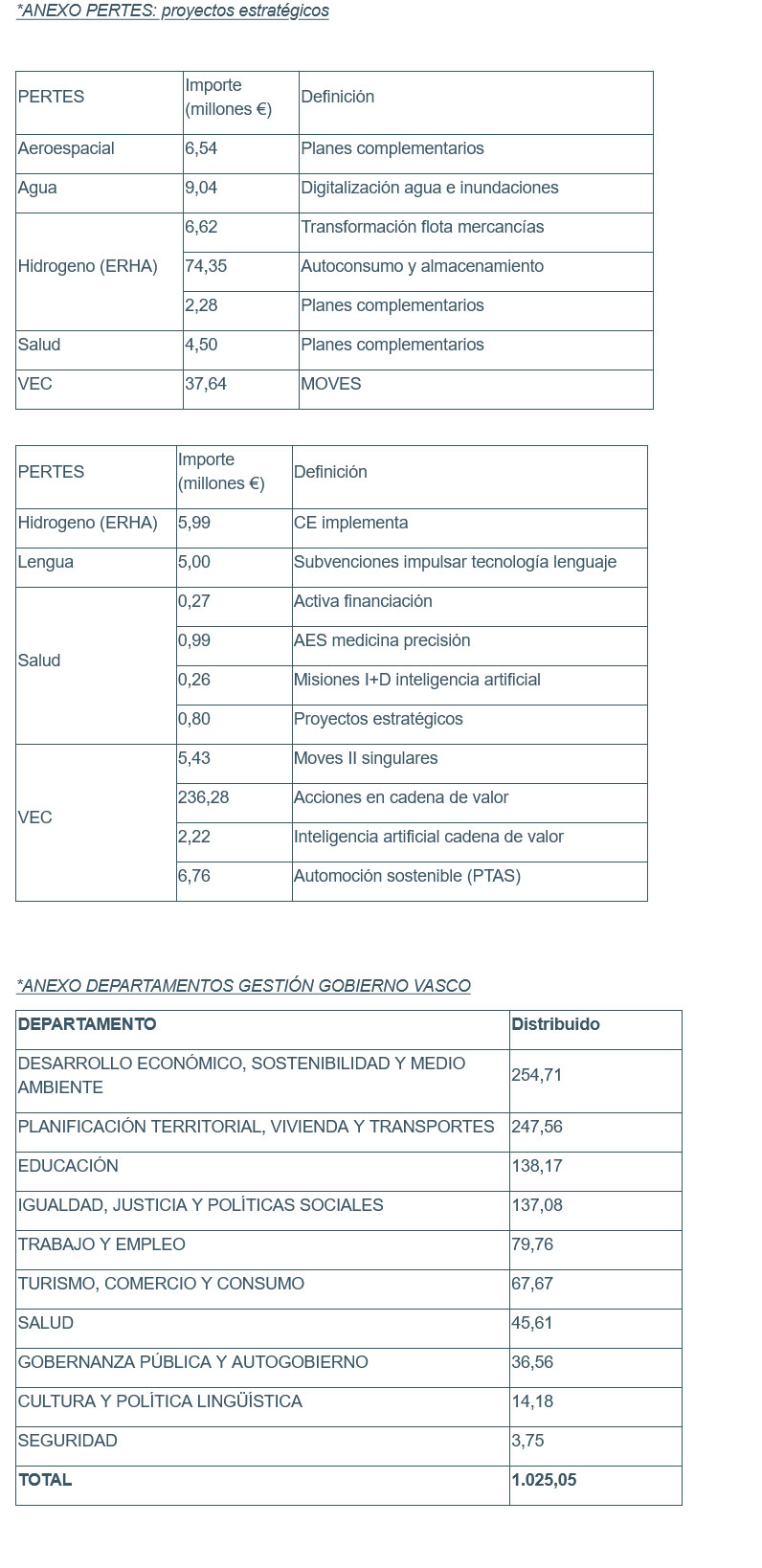 El consejero de Economía y Hacienda, Pedro Azpiazu, ha dado cuenta en el Parlamento Vasco de la situación de los fondos europeos Next Generation –MRR- y de su aterrizaje en Euskadi, con un total de 1.571 millones de euros hasta la fecha, de los cuales 1.025 millones de euros llegan para ser gestionados a través del Gobierno Vasco y 546 millones de euros directamente por el Estado (6,26% del total puesto en marcha por la Administración Central -364 millones de euros más que hace tres meses-). Este incremento se debe principalmente a la activación de las convocatorias de los grandes proyectos estratégicos –Pertes- en los que las empresas vascas tienen gran capacidad de absorción por la capacidad transformadora de sus propuestas, concretamente, han accedido a 405 millones de euros. *anexo final