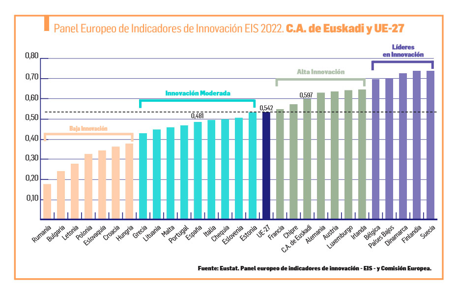 La comparación que hace el Instituto Vasco de Estadística, Eustat, del último Panel Europeo de Indicadores de Innovación-European Innovation Scoreboard (EIS 2022), señala que en Euskadi se alcanza un valor de 0,597, puntuación superior a la de la media de la UE-27, que se sitúa en 0,542. Este dato posiciona al País Vasco al nivel del grupo de países innovadores fuertes, al obtener una media entre el 100% y el 125% de la registrada por la UE-27 –en concreto, del 110,1%–, mientras que España se sitúa entre los países innovadores moderados, con un valor de 0,481. Desde 2016, Euskadi se sitúa, siempre según los datos elaborados por Eustat, en el grupo de países ‘innovadores fueres’ (como Irlanda, Luxemburgo, Austria, Alemania, Francia…) y 2022 es el segundo año consecutivo que supera la media europea.