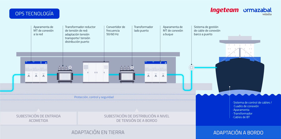 La solución técnica, liderada por Ormazabal y desarrollada conjuntamente con Ingeteam, se fundamenta en una instalación de 2 x 8 MVA –utilizando celdas de media tensión, transformadores y convertidores de frecuencia - para ofrecer hasta 16 MVA y un solo punto de conexión con posibilidad de ampliación futura de hasta 24 MVA y dos suministros simultáneos. Un sistema que se conectará a un centro de distribución de la red, y en el futuro mediante una conexión directa a una subestación, y que, además, permitirá establecer la frecuencia de funcionamiento del barco atracado en 50 o 60 Hz.