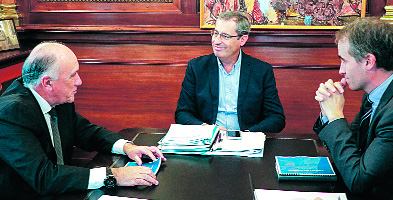 El diputado general compartió impresiones con el presidente y el director general de Elkargi, Josu Sánchez y Zenón Vázquez.