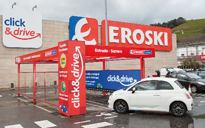 A la ya tradicional entrega a domicilio de pedidos online, Eroski ha sumado una serie de nuevos servicios que refuerzan su estrategia multicanal y la conexión entre el mundo físico de su red de tiendas y el virtual de su supermercado online. Es el caso del servicio ‘Click & Drive’, que combina la facilidad de la compra online, a cualquier hora y desde cualquier lugar, con la recogida del pedido sin salir del coche en el puesto de entrega rápida instalado en el aparcamiento de uno de sus establecimientos, donde personal responsable del servicio carga el pedido directamente en el maletero del cliente en menos de cinco minutos, sin esperas y sin que el cliente tenga que salir de su vehículo.