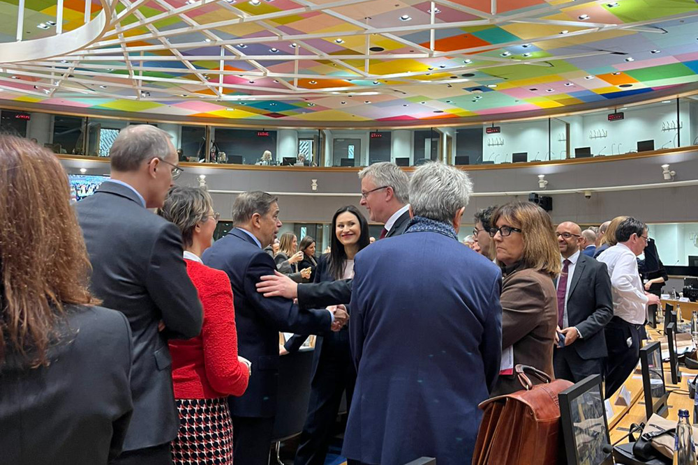La consejera Amaia Barredo, acompañada de Leandro Azkue, viceconsejero de Pesca, Puertos y Litoral, e Ixone Soroa, directora de Pesca y Acuicultura, en el Consejo de ministros de Agricultura y Pesca de la Unión Europea. Foto: Irekia