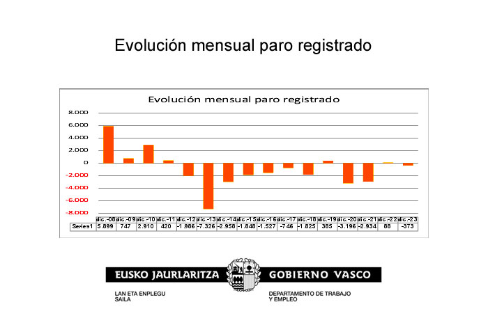 El paro se ha reducido en diciembre en Euskadi en 373 personas, un 0,34%, hasta situarse en 107.799 desempleados, según los datos registrados en el Servicio Público Vasco de Empleo Lanbide. En relación a hace un año, diciembre de 2022, hay 3.019 parados menos.