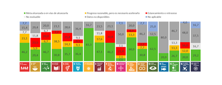 El gráfico muestra la evaluación del progreso en los indicadores, agrupados por cada uno de los 17 Objetivos.