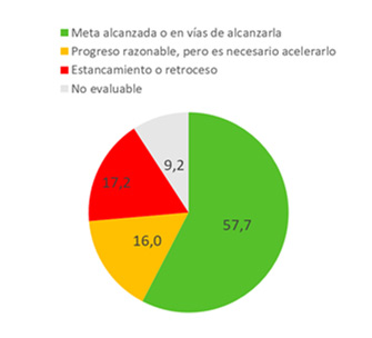 Considerando solo los indicadores para los que se dispone de información para Euskadi (es decir, sin tener en cuenta los que no son aplicables y los que actualmente no tienen datos disponibles), en un 57,7 % de los indicadores se ha alcanzado la meta o está en vías de alcanzarse antes de 2030, en un 16 % se está progresando de manera razonable, pero es necesario acelerar para alcanzar la meta, y en un 17,2 % Euskadi se encuentra en situación de estancamiento o retroceso. En un 9,2 % de los indicadores, el progreso no es evaluable actualmente, por carecer de datos o información de contexto suficiente.