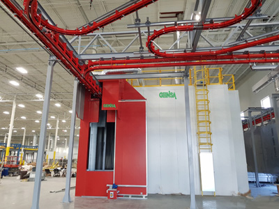 Cada cabina de pintura está provista de un cerramiento ventilado y acondicionado, que dispone de un sistema de renovación y un sistema de enfriamiento de aire.