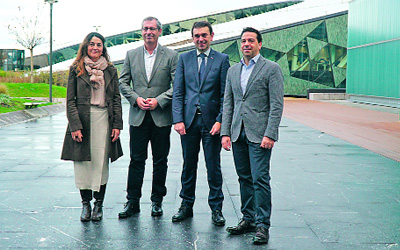 Idoia Peñacoba, secretaria general de MU; el diputado general de Gipuzkoa, Markel Olano; el rector de MU, Vicente Atxa, y el diputado foral Imanol Lasa, en las instalaciones de Orona Ideo.