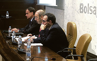 Hagen Hügelschäffer, director adjunto de la AKA; Ignacio Etxeberria, presidente de la Federación de EPSV de Euskadi, y el profesor de Deusto, Francisco Javier Arrieta, ponentes de la jornada.