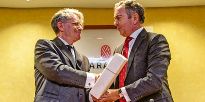 El presidente de Petronor, Emiliano López Atxurra, recibe el reconocimiento del presidente de Camarabilbao, José Ángel Corres.