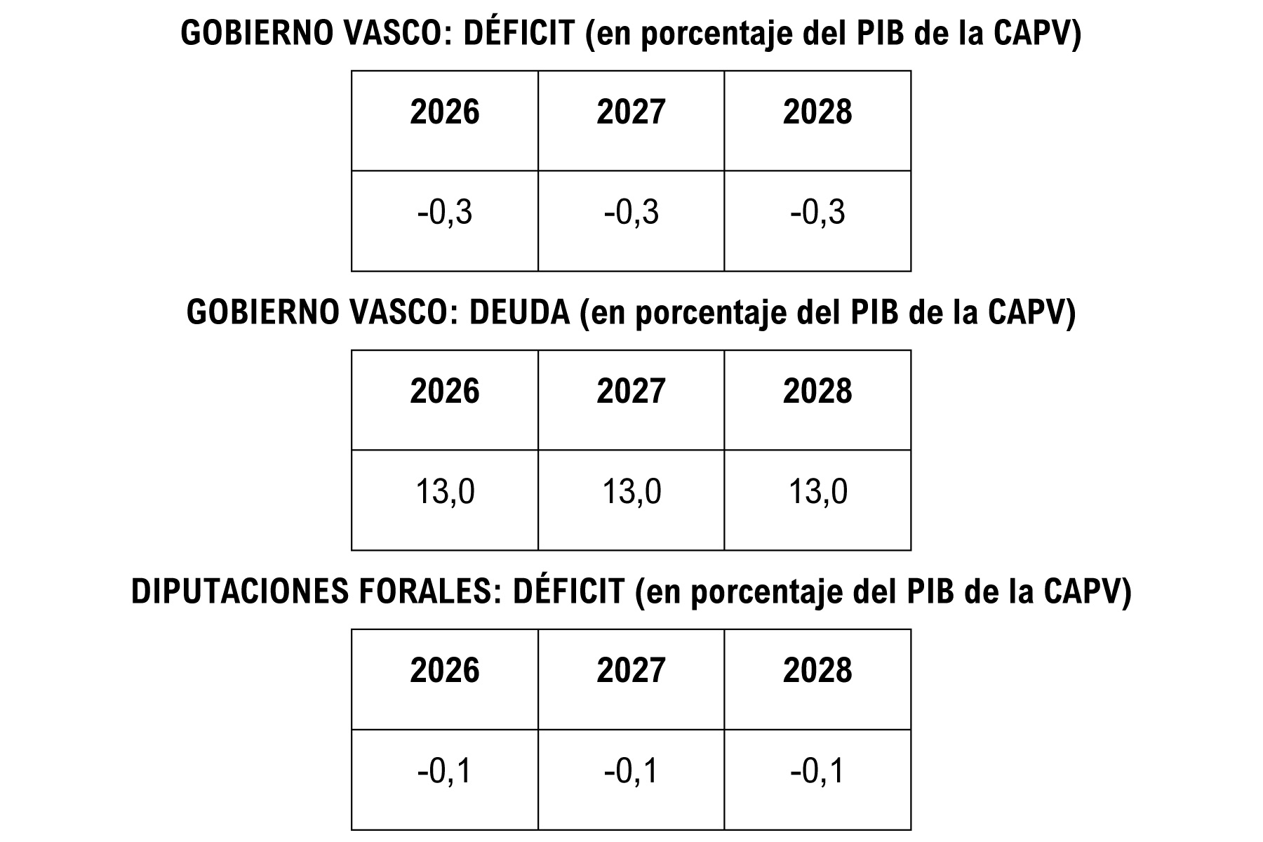 Se ha acordado un déficit del -0,3 y una deuda pública del 13% para el Gobierno vasco, y un déficit del -0,1% para las Diputaciones Forales para el periodo 2026-2028: