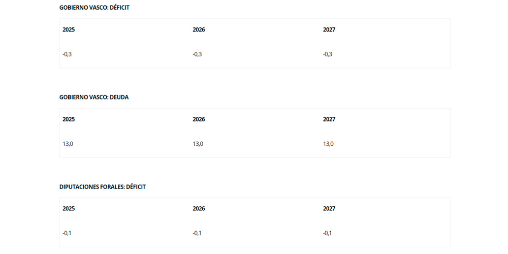 En lo referente a la estabilidad presupuestaria de 2024, se ha acordado un déficit del -0,3 y una deuda pública del 13% para el Gobierno vasco, y un déficit del -0,1% para las Diputaciones Forales.