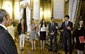 El diputado general de Bizkaia, Unai Rementeria, saluda a los miembros de la delegación de Idaho en el Palacio foral.