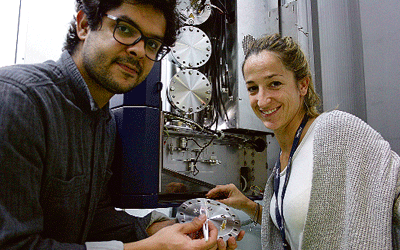 Thales de Oliveira y María Arbulu , impulsores y trabajadores de Prospero, trabajando con un espectrómetro de masas en CIC nanoGUNE.