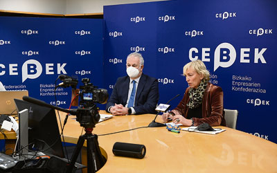 En rueda de prensa, la presidenta de Cebek, Carolina Pérez Toledo, y el secretario general de la organización empresarial, Francisco Javier Azpiazu, desgranaron otros detalles de la encuesta, antes de hacer un análisis y una prospección del escenario económico y empresarial de Bizkaia y Euskadi en 2022.
