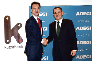 Ander Aizpurua, director de Banca Mayorista de Kutxabank, y J. M. Ayerza, secretario general de Adegi, en la firma del acuerdo.