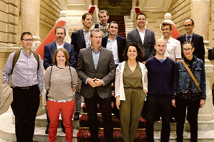 El diputado general de Gipuzkoa, Markel Olano; la diputada de Promoción Económica, Medio Rural y Equilibrio Territorial, Ainhoa Aizpuru; y el director de Innovación, Garikoitz Agote, mantuvieron tras la recepción oficial en el Palacio Foral, un encuentro con la red de centros e investigadores beneficiarios del Programa Fellows Gipuzkoa de atracción y retención de talento.