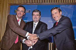 El consejero Juan Maria Aburto firmó con los representantes de Laboral Kutxa y Kutxabank el primer convenio de microcréditos.