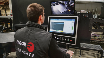Un operario de Fagor Arrasate, trabajando en una línea de corte por láser.