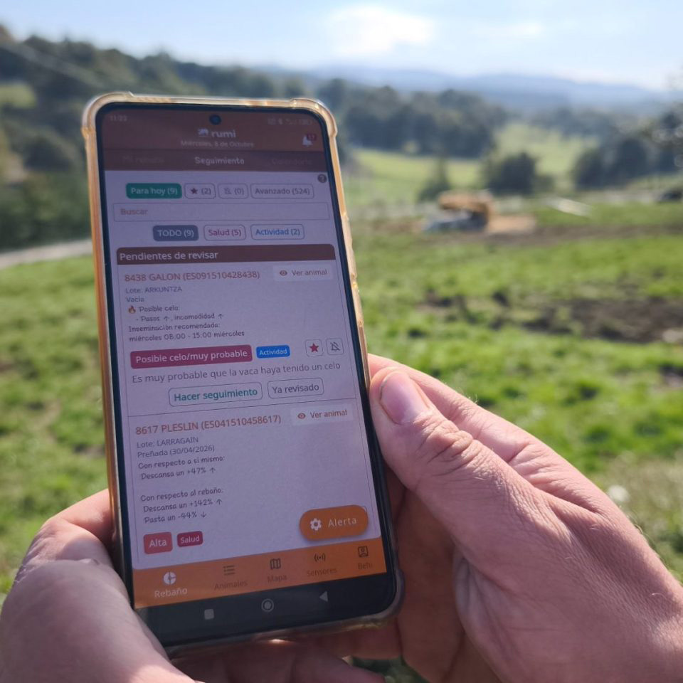 La herramienta está optimizada para ganado vacuno y en Larresne se utilizará en una ganadería de vacuno lechero. Además, se testará en ovino latxo, adaptando la tecnología a las particularidades de cada sector. En el caso del vacuno, el sistema Rumi ya está validado por Neiker y permite a los ganaderos recibir información inmediata sobre celo, parto y posibles alteraciones de salud-bienestar. Esta monitorización continua facilita al ganadero la organización de las tareas, le permite anticiparse a distintos eventos y contribuye a mejorar el bienestar de los animales. Además, abre la posibilidad de certificar la leche de pasto, aportando trazabilidad, diferenciación y transparencia frente al consumidor.