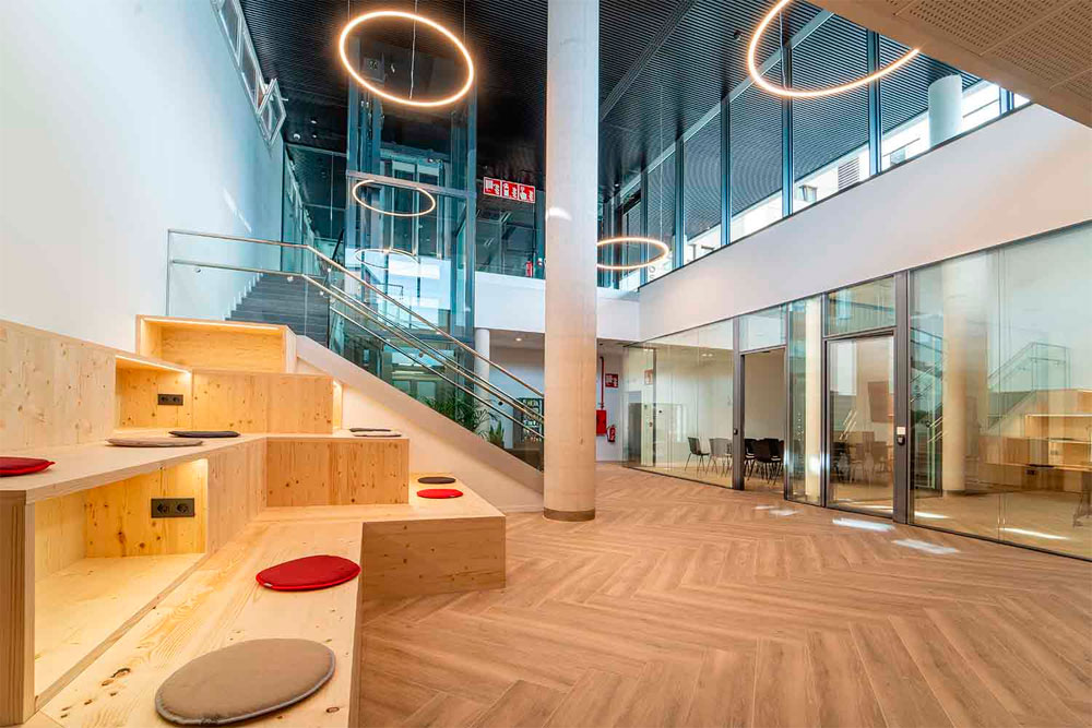 Además de la Oficina de Atención a la persona Emprendedora, el edificio cuenta en sus zonas comunes con cuatro despachos profesionales, zona de coworking salas de formación, auditorio y un espacio para reuniones y eventos. En las plantas superiores se distribuyen 70 apartamentos de superficies comprendidas entre 25 m² y 45 m², destinados a alojar personalmente a personas vinculadas con el ámbito de la innovación y de los que 12 están reservados a jóvenes donostiarras.