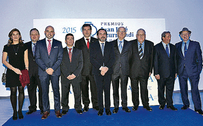 Los galardonados en la XV Edición de los Premios Juan José Azurmendi posan junto al presidente de SEA, Pascal Gómez.