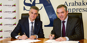 El secretario general de SEA, Juan Ugarte (a la izquierda) y el director del Área de Empresas de Laboral Kutxa, Josu Arraiza, han firmado un convenio por el que la entidad financiera pone a disposición de las empresas alavesas una línea de financiación de 150 millones de euros, con el objetivo de animar la inversión y sumar puntos a la competitividad empresarial en el territorio. Podrán beneficiarse de él, en condiciones preferenciales, las empresas asociadas a la patronal, en un momento en que la tendencia de la economía alavesa “está cambiando”.