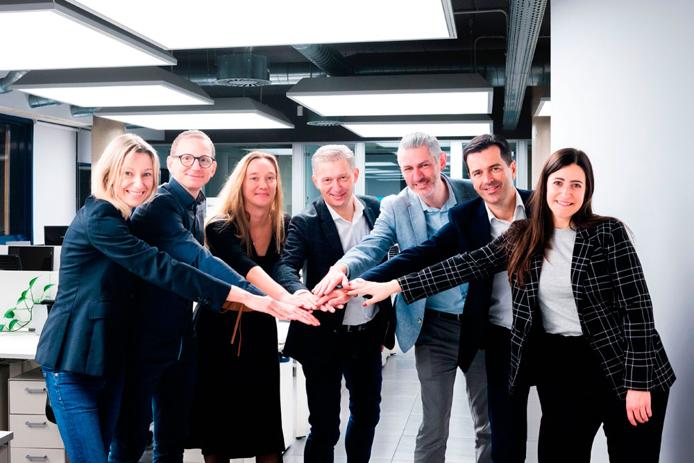 De izquierda a derecha: Ainhoa Lete (CEO BuntPlanet), Matthias Giczi (Siemens), Anja Eimer (Siemens), Bart Moors ( Siemens), Adam Cartwright (Siemens), Raul Navas (COO BuntPlanet), Anna Elisabeth Meier (Siemens). Foto: Siemens