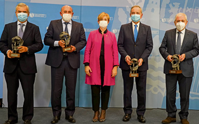 Los empresarios Jesús María Guibelalde, José María Bergareche, Antton Suquía y José Luis Larrañaga recibieron de manos de la consejera de Desarrollo Económico, Sostenibilidad y Medio Ambiente, Arantxa Tapia, los Premios Korta 2020 en un acto celebrado en la sede del Gobierno vasco.