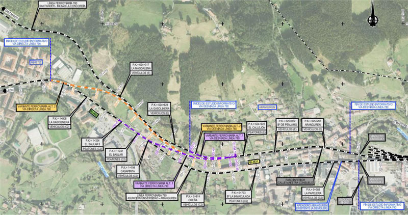 Con este objetivo se han analizado dos alternativas en las que se define un nuevo trazado ferroviario (variante ferroviaria) que conecta las dos líneas que existen en la zona, consiguiendo eliminar doce pasos a nivel (siete sobre la línea 08-790, hacia Balmaseda, y cinco sobre la línea 08-780, hacia Santander).