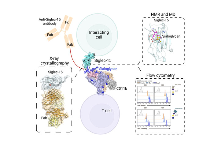 El estudio ha revelado que la unión de Siglec-15 a las células T, que carecen de expresión de STn, depende de la presencia de otros sialoglicanos. Además, el estudio ha identificado la integrina leucocitaria CD11b como un ligando de Siglec-15 en células T humanas. Estos descubrimientos proporcionan una comprensión integral de las características estructurales de Siglec-15 y enfatizan el papel crucial de la glicosilación para el control de las respuestas de las células T de nuestro sistema inmune.
