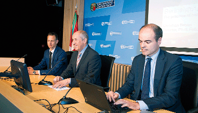 El consejero de Administración Pública y Justicia, Josu Erkoreka, junto al director de Atención a la Ciudadanía e Innovación y Mejora de la Administración, Javier Bikandi, en la presentación del PIP 2014-2016.