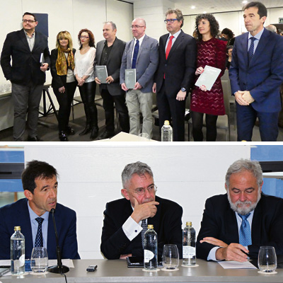 En la realización del libro ‘Los empresarios y ETA. Una historia no contada’ han participado profesores universitarios y periodistas (a la izquierda, parte de ellos), entre los que se encuentra Roberto Urkitza, consejero delegado-director de ESTRATEGIA EMPRESARIAL. Debajo, un momento de la presentación de esta publicación, con Juan José Álvarez, Emiliano López Atxurra y José Ignacio Zudaire.