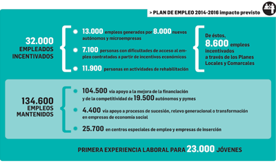 Del conjunto de actuaciones planificadas a lo largo de 2014, el Departamento de Empleo y Políticas Sociales del Gobierno vasco espera como resultado 10.676 nuevos empleos bien sea mediante incentivos directos a la contratación, empleo en rehabilitación, por creación o crecimiento de empresas. Igualmente espera mantener el empleo de otras 44.876 personas mediante financiación a empresas o mejora de la competitividad o consolidación de pymes, y elevar la empleabilidad de 119.351 personas, de las cuales 7.600 se estima podrían ser jóvenes en su primera experiencia laboral.